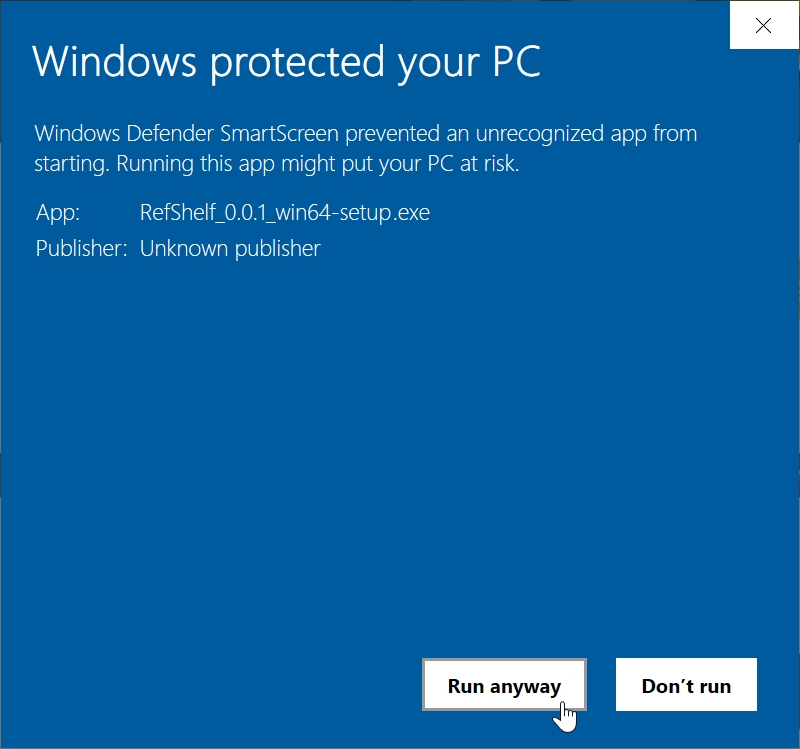 Another type of warning you may get from your operating system. For example, Windows 10 checks the signature of the executable file before running it. If you run downloaded installer right from the default downloads folder of your browser, you can get the warning like this: "Windows Defender SmartScreen prevented an unrecognized app from starting. Running this app might put your PC at risk.".