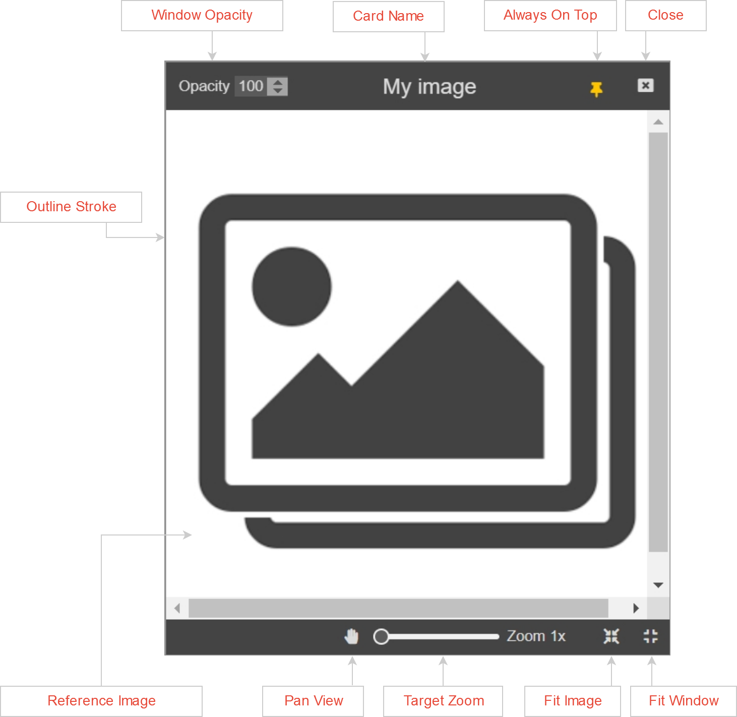 Reference Image - is the original image file located on your drive from which the corresponding Card and its Image Thumbnail was created. The Card contains a link to this specific file, and this exact file will then be opened for viewing in the Ref Image Viewer when you double-click on the Card.